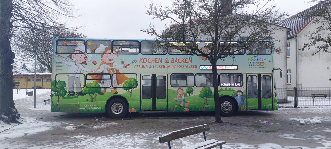 Vor allen anderen war er da – der bunt blinkende historische Koch- und Backdoppeldeckerbus der Essen Wissen Stiftung Eildermann. „An die Schürzen, fertig, los“ hieß es dann für unsere Erst-, Zweit-, Viert- und Fünftklässler, die unter Anleitung Cashewcreme und Knuspermüsli zubereiteten, probierten, nebenbei einiges über Lebensmittel lernten und Kochtipps bekamen. Ein besonderes Highlight in einem echten Hingucker!