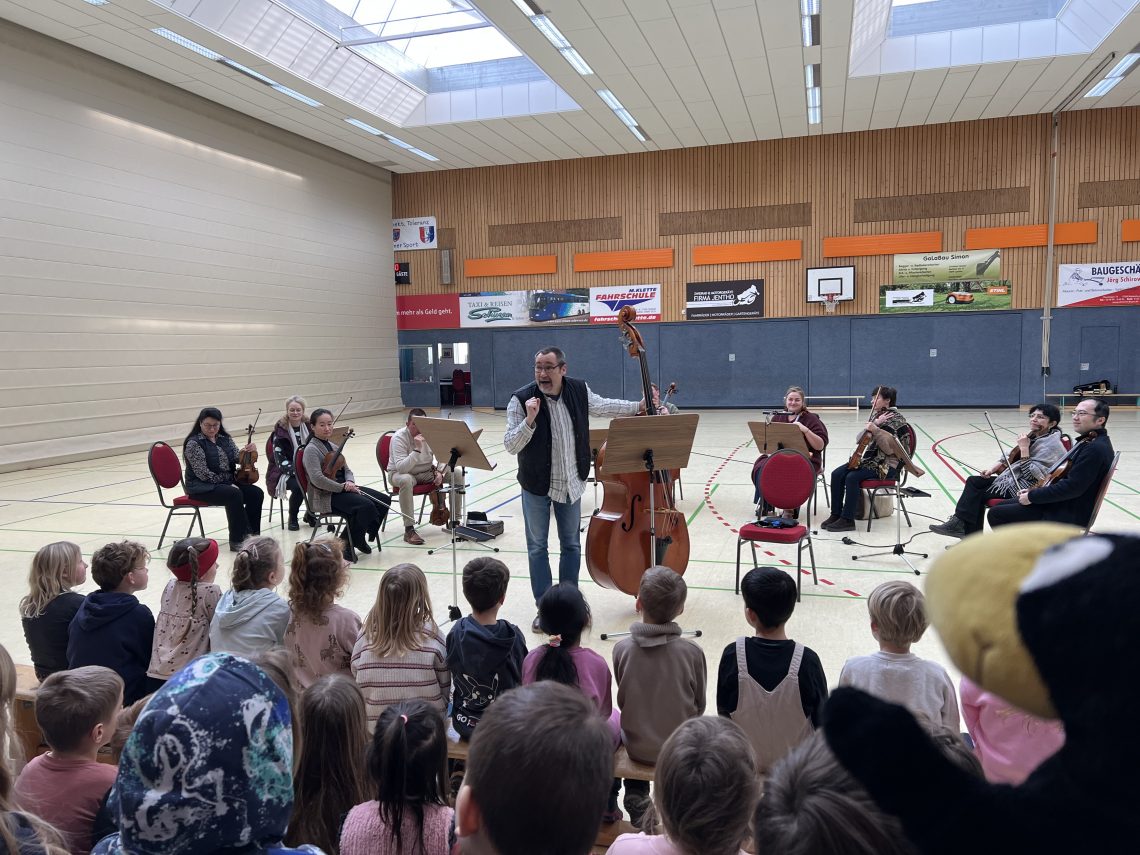 Am Donnerstag gab es besonderen Besuch in der Turnhalle: der königliche Löwe, tanzende Schildkröten, der gemütliche Elefant, der unverkennbare Kuckuck und wilde Ponys hielten uns ordentlich auf Trab. Ihr habt es sicher schon erkannt: der Karneval der Tiere war mit dem Preußischen Kammerorchester zu Gast!